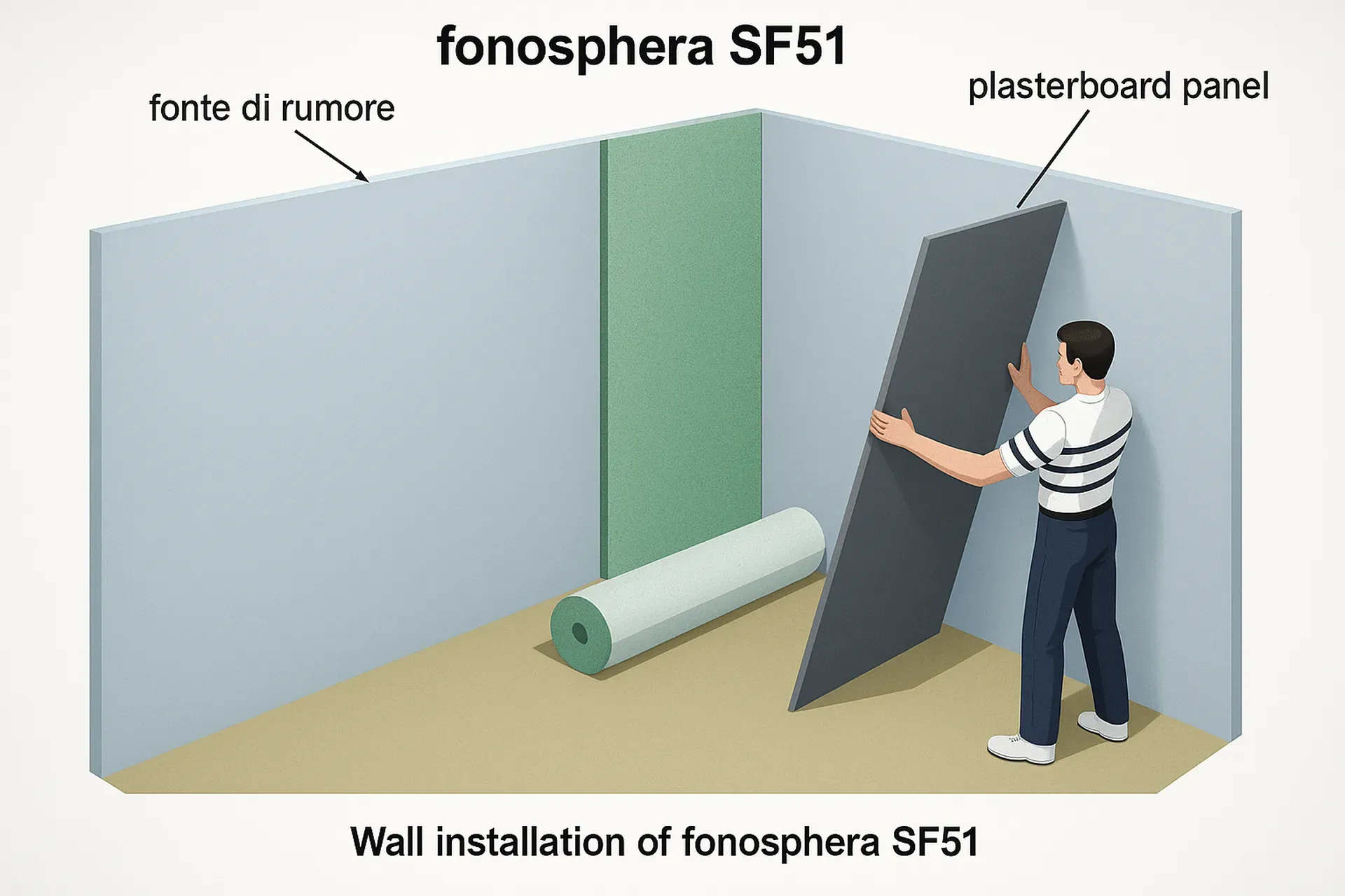 Indicato per isolamento acustico per via aerea, impedisce il passaggio del suono da un ambiente ad un altro