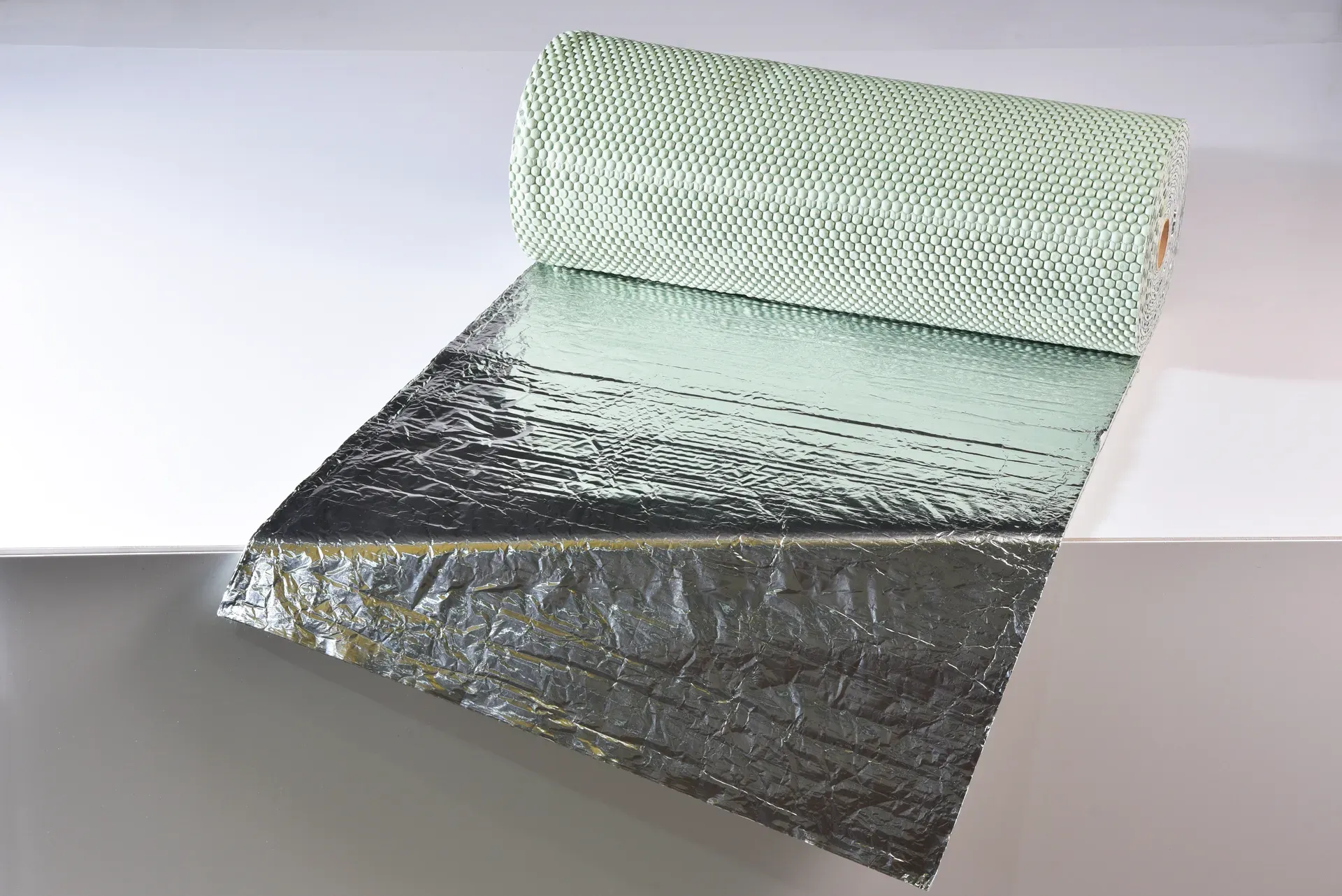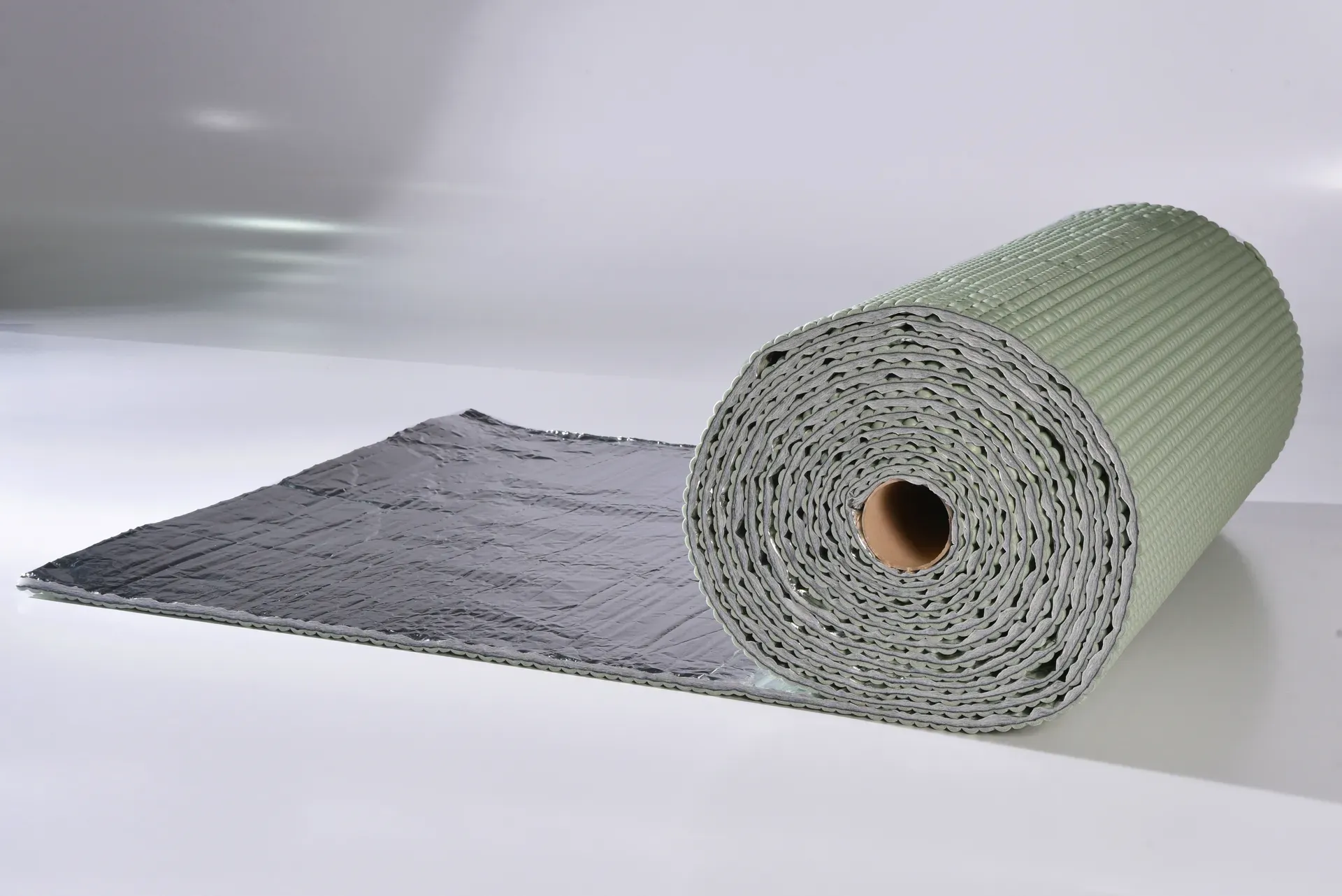 È un accoppiato sandwich composto da uno strato di polietilene termoformato sagomato a calotte sferiche. La massa è a base polimerica a cariche minerali a basso modulo meccanico, studiata per realizzare un elevato isolamento acustico. La massa è infine accoppiata ad uno strato di fibra di poliestere, di spessore 10 mm, e rivestita da film in alluminio che protegge dall’irradiamento termico.